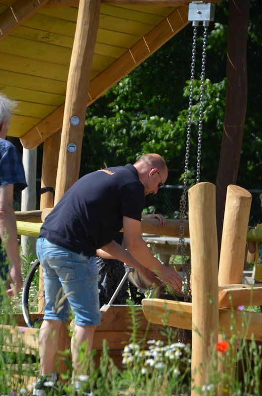 In 2011 kwamen we in contact met de Speeltuinbende en toen hebben we besloten om nog meer toegankelijke toestellen te plaatsen: een draaimolen waarop ook twee rolstoelen kunnen staan, picknicktafels, een waterspeelplaats, een hijstoestel voor zand en water en een clubgebouw met rolstoeltoilet.